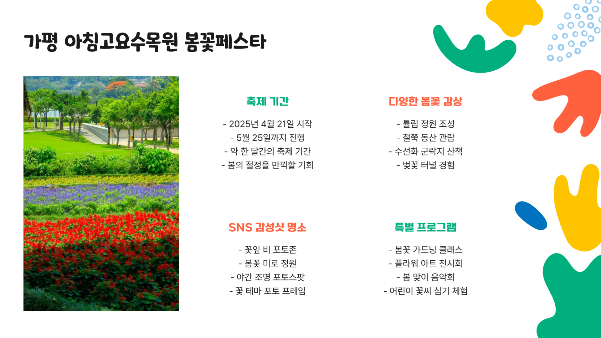 가평의 아침고요수목원에서는 2025년 4월 21일부터 5월 25일까지 봄꽃페스타가 열려요. 🌷 튤립, 철쭉, 수선화, 목련, 진달래, 매화, 개나리, 벚꽃까지! 정말 다양한 봄꽃들이 군락을 이루며 방문객들을 맞이합니다. 특히 사진 찍기 좋은 포토존이 많아서 SNS 업로드용 감성샷을 건지기 딱 좋아요. 입장료는 어른 11,000원, 청소년 8,500원, 어린이 7,500원입니다. 주말마다 플리마켓이 열리고, 어린이를 위한 식물 심기 체험도 준비되어 있어서 가족 단위 방문객에게 강력 추천드려요!