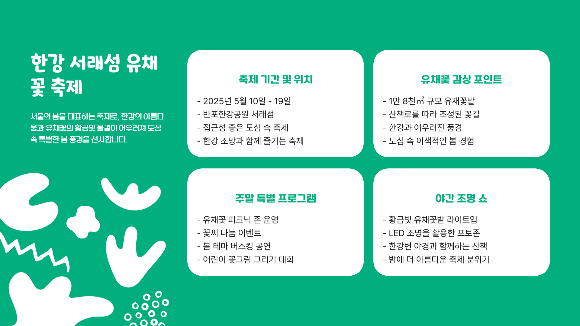 | 주요 프로그램 | 유채꽃 포토존, 체험 부스, 야간 조명 |