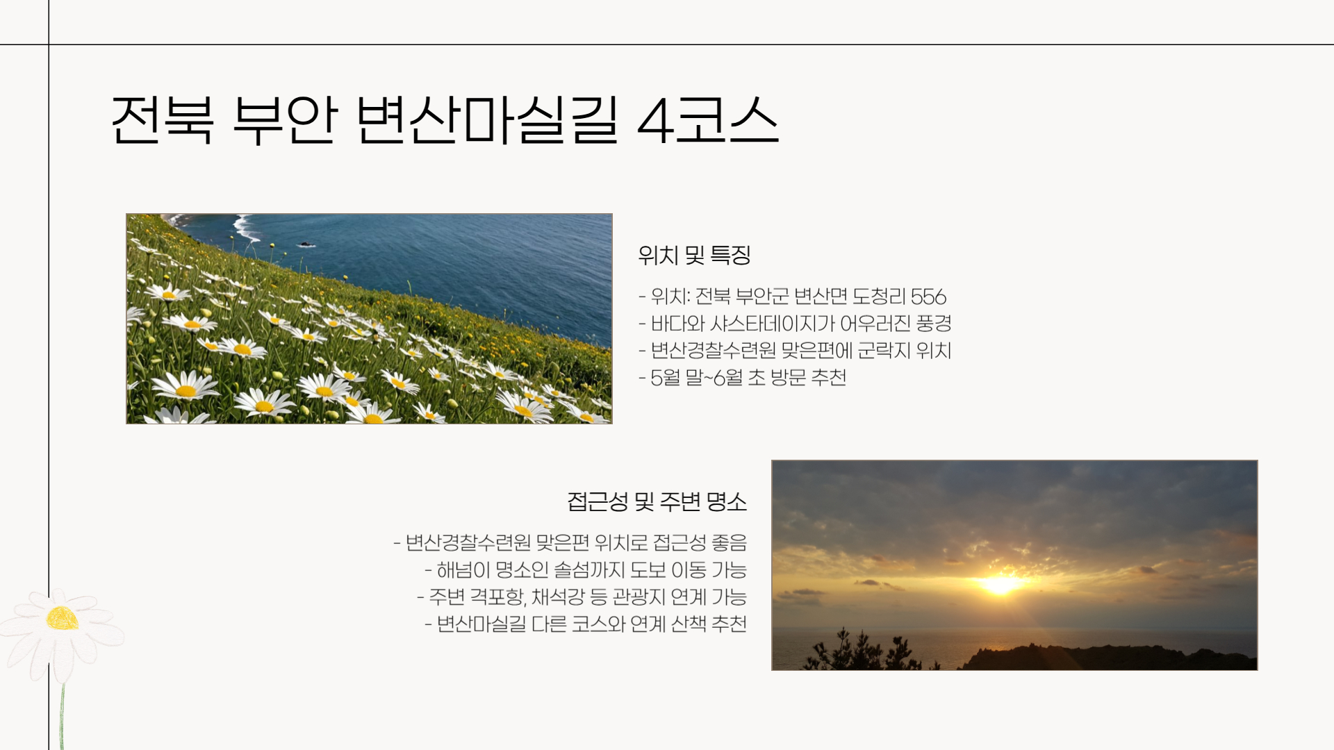 부안 변산마실길 4코스는 꽃과 바다, 해넘이까지 한 번에 즐길 수 있는 완벽한 경로입니다. 도청리 556 일대에 샤스타데이지 군락지가 조성되어 있으며, 바로 앞의 변산경찰수련원이 랜드마크 역할을 해주니 찾기도 쉬워요. 산책을 마치고 솔섬에서 해지는 풍경을 보면, 이보다 더 낭만적인 하루는 없을 거예요.