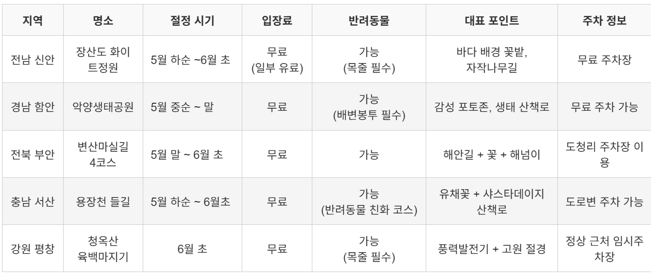 아래 표는 소개한 다섯 곳의 샤스타데이지 명소를 한눈에 비교한 자료입니다. 여행 계획을 세울 때 참고해보세요!