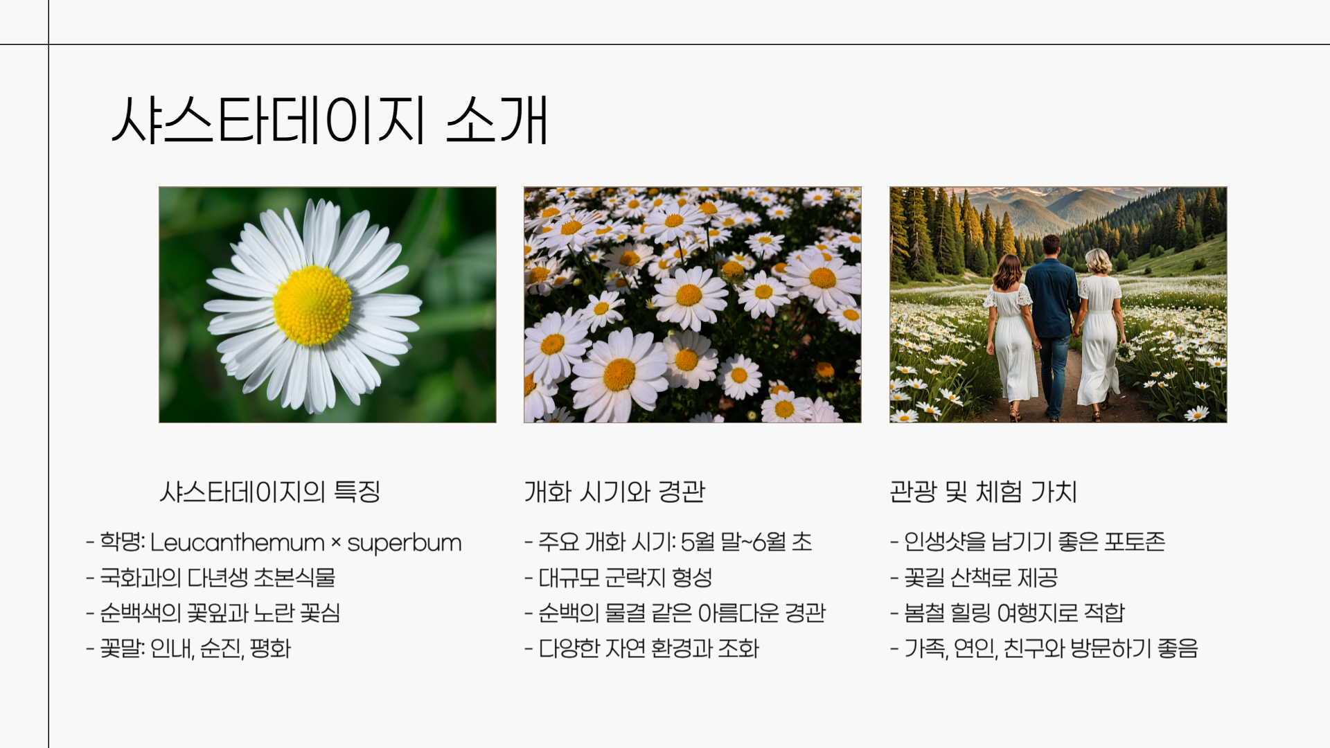따뜻한 바람과 함께 봄꽃 향기가 가득한 5월, 어디론가 떠나고 싶은 계절입니다. 특히 지금, 전국 곳곳이 순백의 샤스타데이지로 물들며 진정한 봄의 정취를 선사하고 있어요.