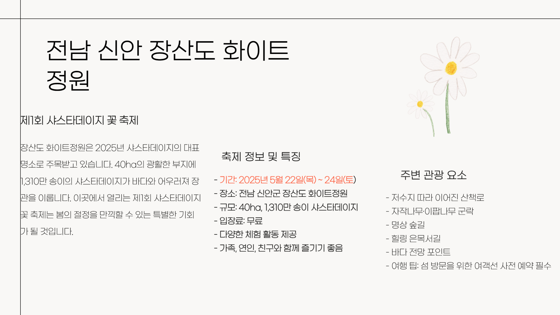 전남 신안 장산도 샤스타데이지 축제|화이트정원 꽃물결 명소