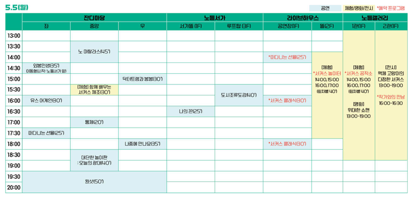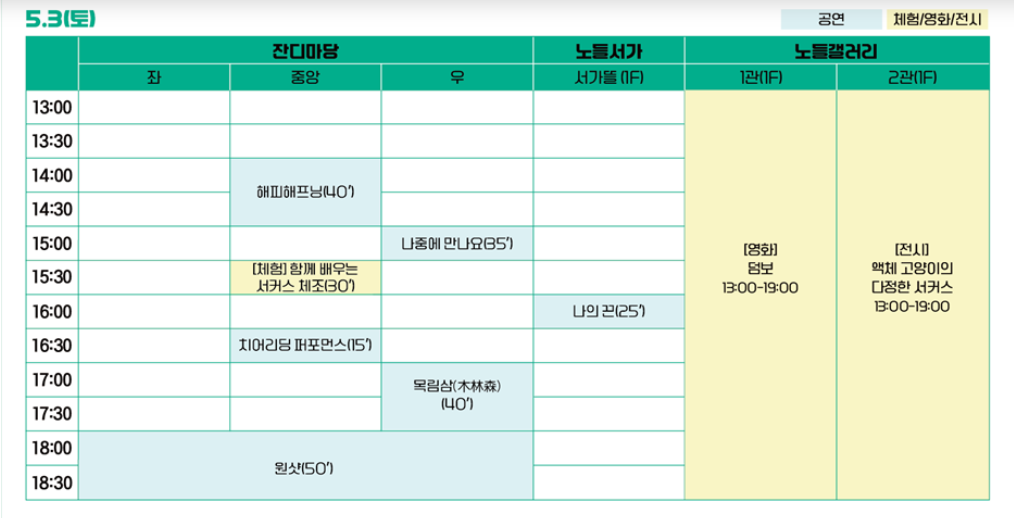 - 포인트: 국내외 서커스 공연, 키즈 체험, 거리 퍼포먼스