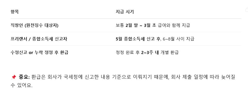 보통 2월 말~3월 초 사이에 입금되며, 근로자마다 회사의 신고일정에 따라 차이가 있습니다.