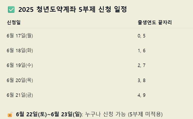 2025년 6월 17일부터 23일까지 첫 접수가 열리며, 처음 5영업일은 출생연도 끝자리 기준 5부제로 운영됩니다. 이후 2일간은 누구나 신청 가능하며, 이후에도 매달 2주간 신청할 수 있어요.