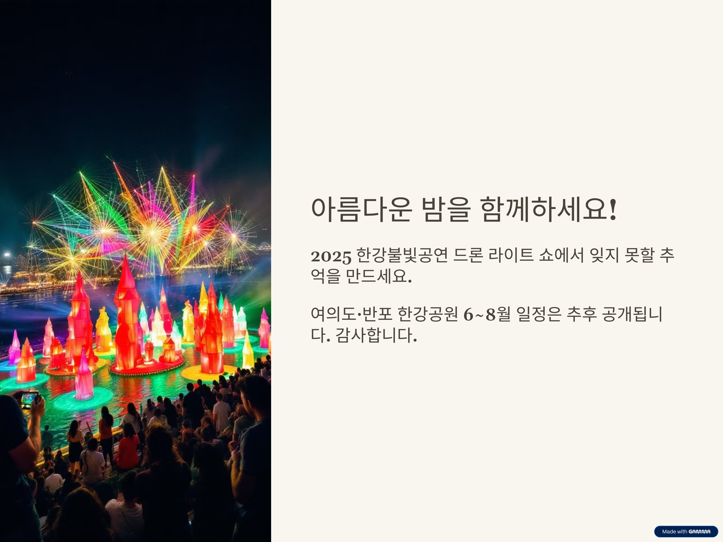 매년 한강의 밤을 아름답게 수놓는 드론라이트쇼가 2025년에도 화려하게 돌아옵니다. 무려 1,200~2,000대의 드론이 한강 상공을 수놓으며 감동적인 빛의 향연을 선사하는 이번 공연은 누구나 무료로 즐길 수 있는 서울 대표 야간축제 중 하나로, 해가 갈수록 관람객들의 기대를 한 몸에 받고 있습니다. 이번 한강 드론쇼는 뚝섬한강공원과 잠실한강공원에서 총 5회에 걸쳐 진행될 예정이며, 드론 공연뿐만 아니라 문화예술공연까지 함께 마련되어 있어 도심 속에서 특별한 저녁 시간을 보내기에 안성맞춤입니다. 밤 8시 30분부터 단 15분간의 드론 퍼포먼스이지만, 감동은 오랫동안 기억에 남습니다. 명당 자리, 주차 꿀팁, 공연 일정까지 모두 정리했으니, 본문을 참고하셔서 최적의 장소에서 최고의 장면을 감상해보세요.