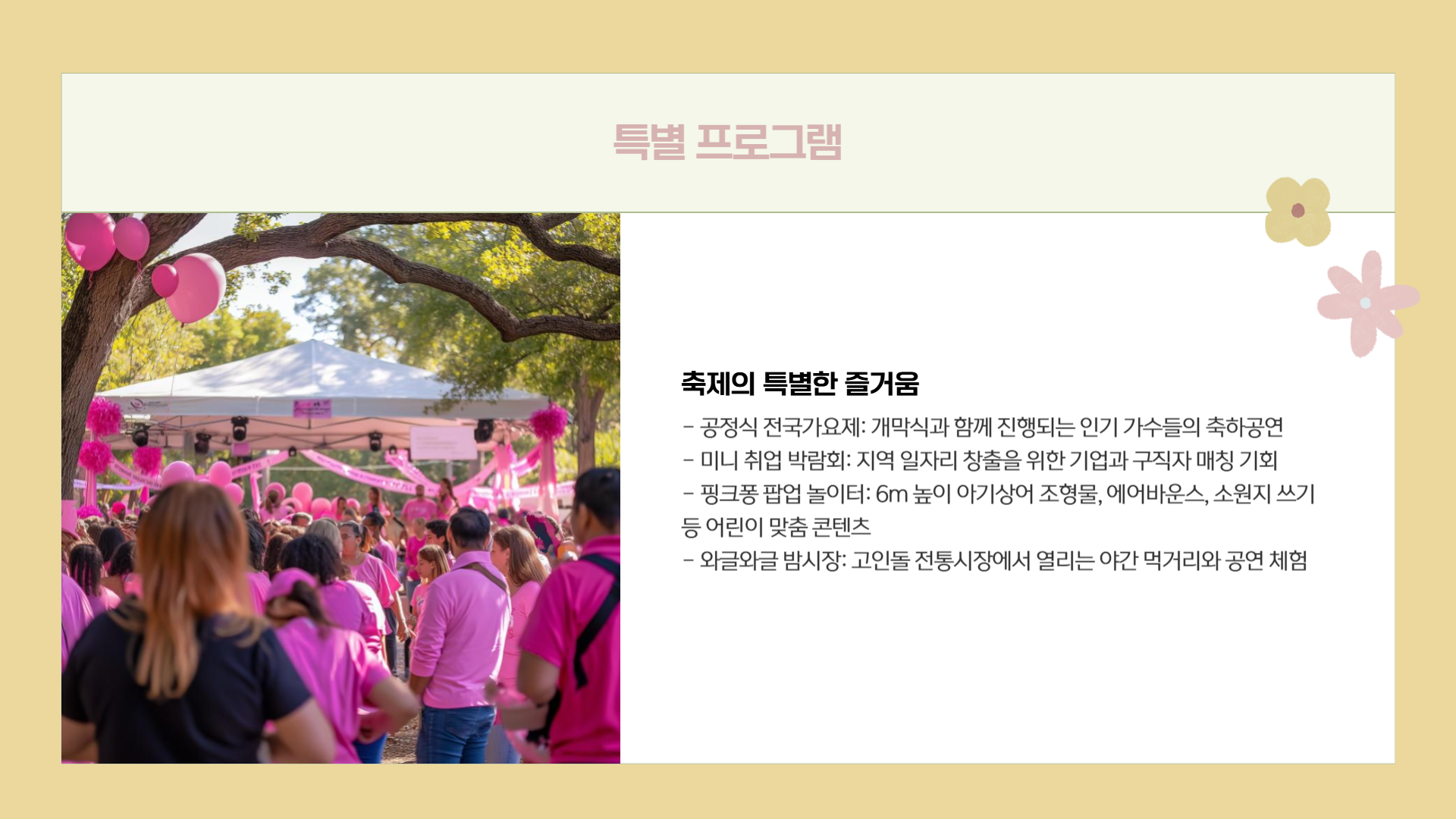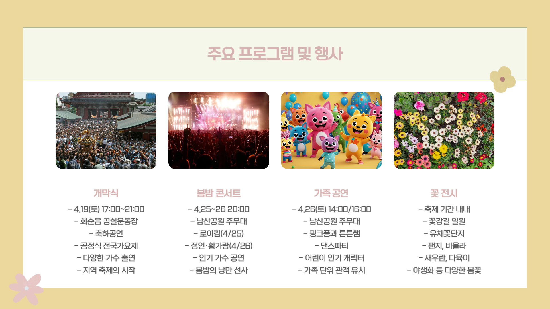 올해 화순 봄꽃 축제에서는 다양한 테마의 특별 프로그램이 준비되어 있어 가족 단위 방문객들에게도 큰 인기를 끌 것으로 예상됩니다.