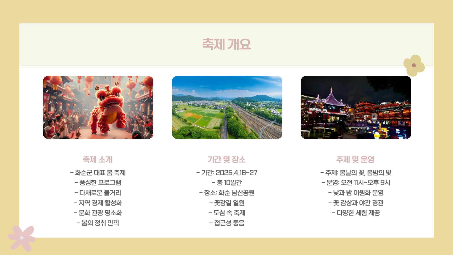 2025 화순 봄꽃 축제는 전남 화순군에서 매년 봄마다 열리는 대표적인 지역축제입니다. 2025년에는 ‘봄날의 꽃, 봄밤의 빛’이라는 주제로 4월 18일부터 27일까지 10일간 진행되며, 남산공원과 꽃강길 일대를 배경으로 펼쳐집니다. 낮에는 봄꽃의 정취를, 밤에는 조명과 함께하는 낭만적인 분위기를 동시에 즐길 수 있는 이원화된 구성으로 더욱 다채롭고 풍성한 경험을 제공합니다.