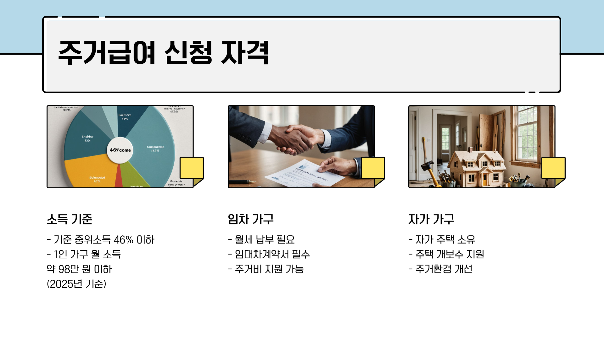 주거급여는 정부가 제공하는 대표적인 주거비 지원 제도로, 특히 경제적 여건이 어려운 1인 가구에게 실질적인 도움이 됩니다. 2025년 기준으로 월 소득 약 98만 원 이하인 1인 가구는 해당 지원을 신청할 수 있으며, 임차 또는 자가 여부에 따라 지원 방식이 달라집니다. 월세를 내는 임차 가구의 경우 임대차계약서를 통해 월세 지원을 받을 수 있고, 자가 가구는 집의 노후 상태에 따라 개보수 비용이 지원됩니다. 조건만 충족한다면 큰 부담 없이 신청이 가능하니, 반드시 자격 여부를 미리 확인하고 준비하는 것이 좋습니다.