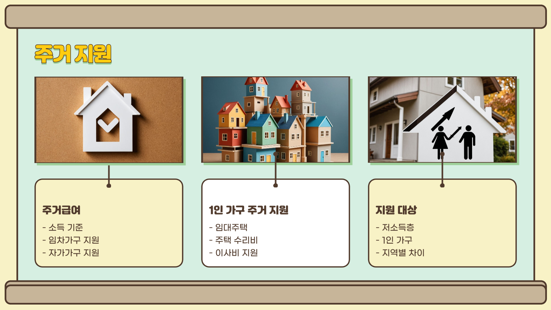 40대 1인 가구가 겪는 가장 큰 어려움 중 하나는 바로 주거 비용입니다. 고정 수입이 적거나 불규칙한 경우 월세를 감당하는 일도 부담스러울 수밖에 없습니다. 이를 고려해 정부에서는 ‘주거급여’ 제도를 운영하고 있습니다. 기준 중위소득 46% 이하인 1인 가구라면 임대료 일부를 보조받을 수 있으며, 자가주택 거주자의 경우 집수리 비용까지 지원됩니다. 서울 기준으로는 최대 월 36만 원의 임차료를 지원받을 수 있기 때문에 실제 체감도도 높습니다. 또한 서울시나 일부 지자체에서는 별도의 ‘1인 가구 주거 지원 사업’을 통해 이사비용이나 주택 수리비를 추가로 지원하고 있어 실질적인 도움이 됩니다.
